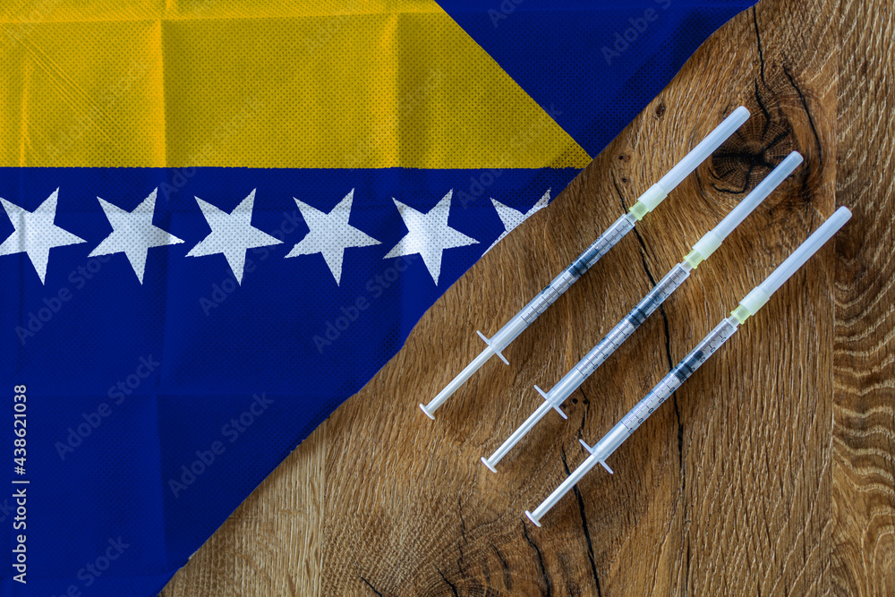 Concept of the ongoing efforts by Bosnia and Herzegowina to deliver and distribute COVID-19 vaccines with three syringes on a wooden table ready to use with a Bosnian Flag. Copy Space
