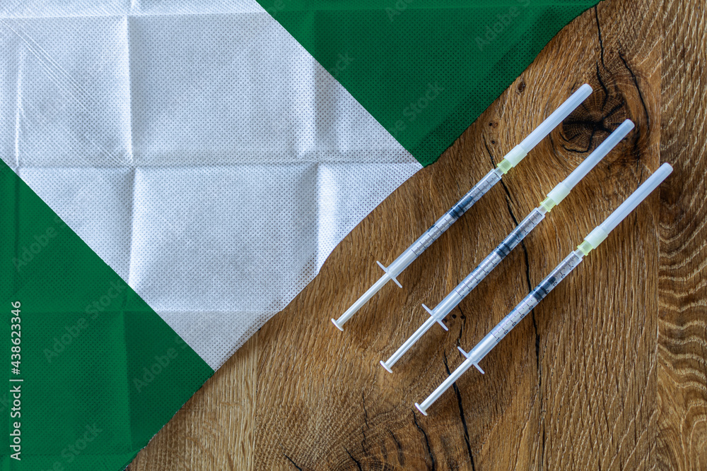 Concept of the ongoing efforts by Nigeria to deliver and distribute COVID-19 vaccines with three syringes on a wooden table ready to use with a Nigerian Flag. Copy Space for Text and Graphics.