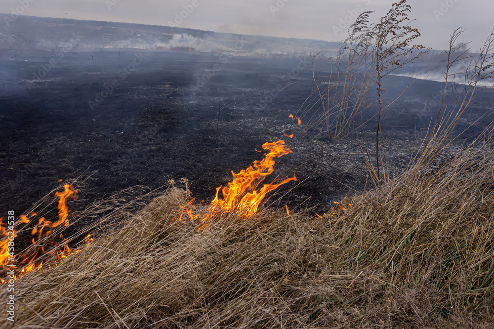 Dry grass is burning in the steppe, a strong wind intensifies the fire.