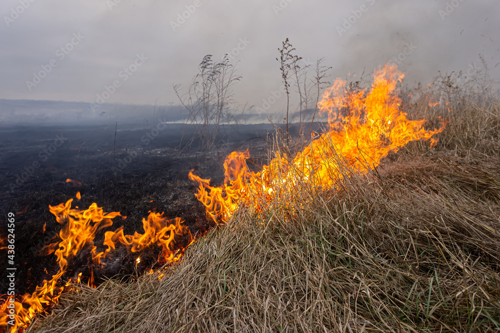 Dry grass is burning in the steppe, a strong wind intensifies the fire.