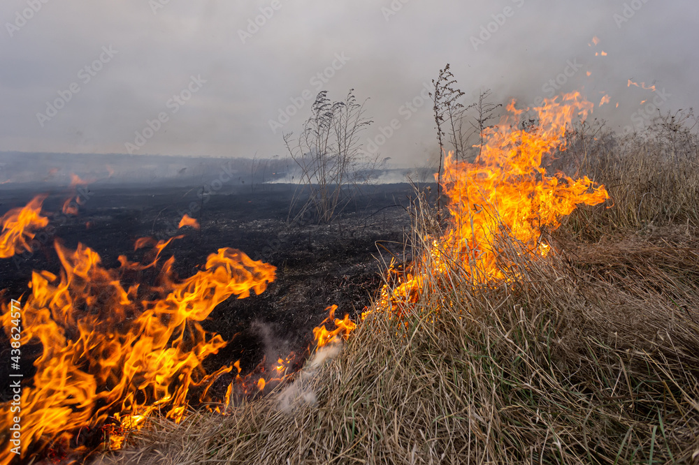 Dry grass is burning in the steppe, a strong wind intensifies the fire.