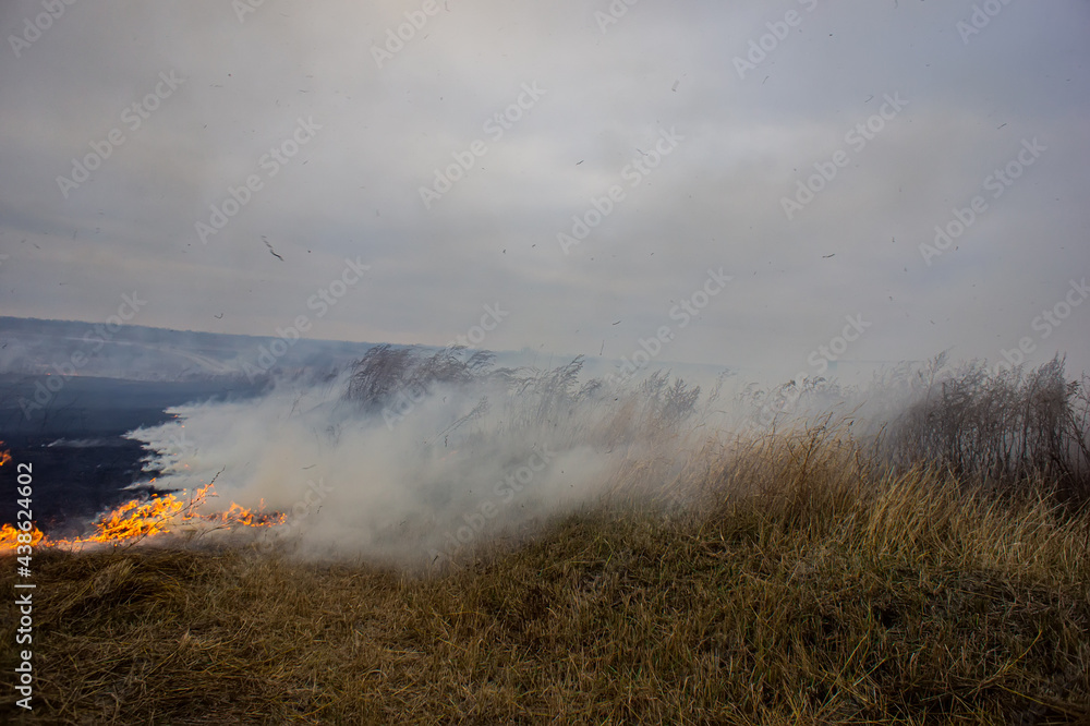Dry grass is burning in the steppe, a strong wind intensifies the fire.