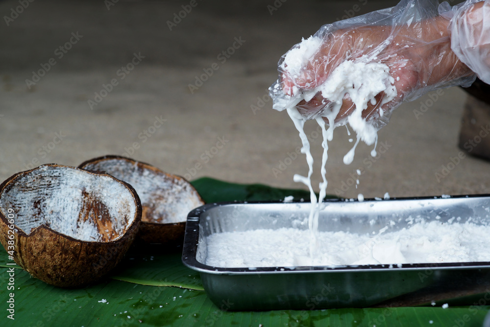 Thai traditional coconut milk production, Coconut milk, natural ingredients Used to make food and desserts that are important to Thai people.