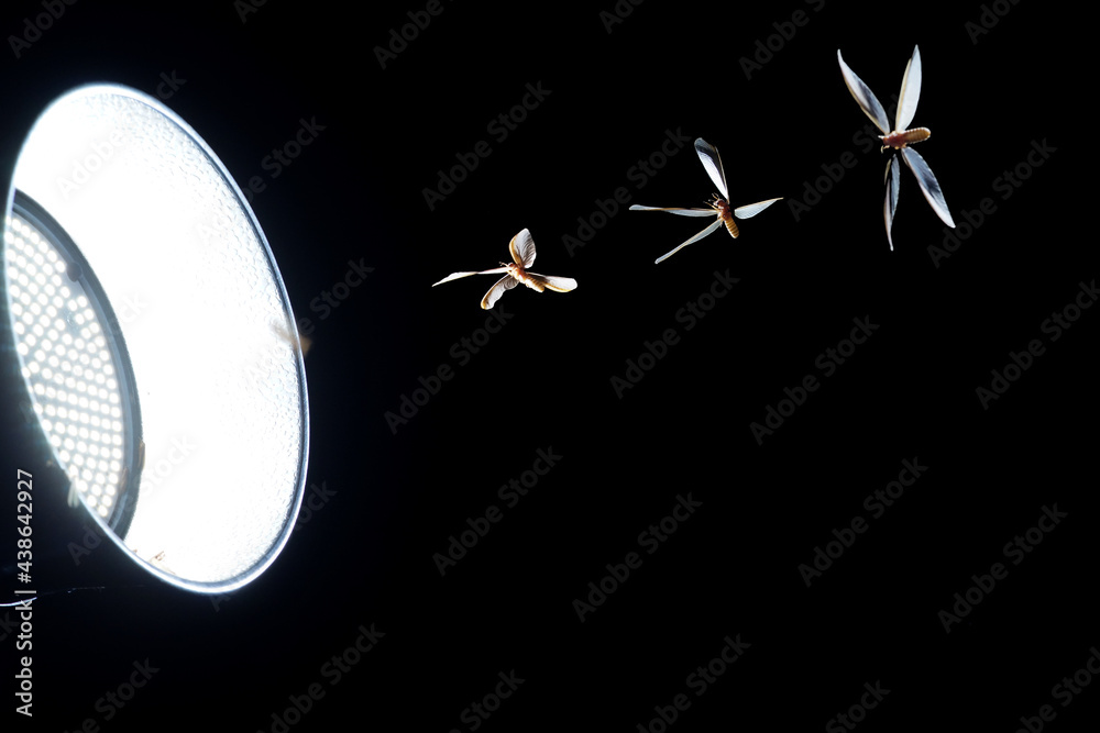Low key image and blur to highlight the lights in the night long and flying animation play light around the fire of Termite Flying or alates after rain in the rainy season.