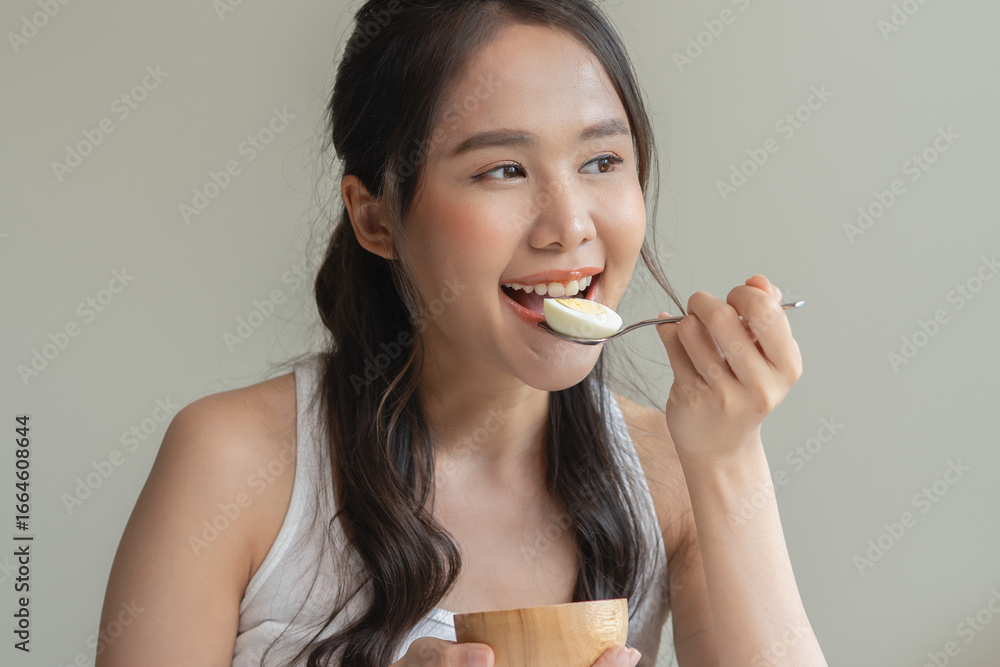 豚の貯金箱をもち喜ぶ家事代行の女性作業員