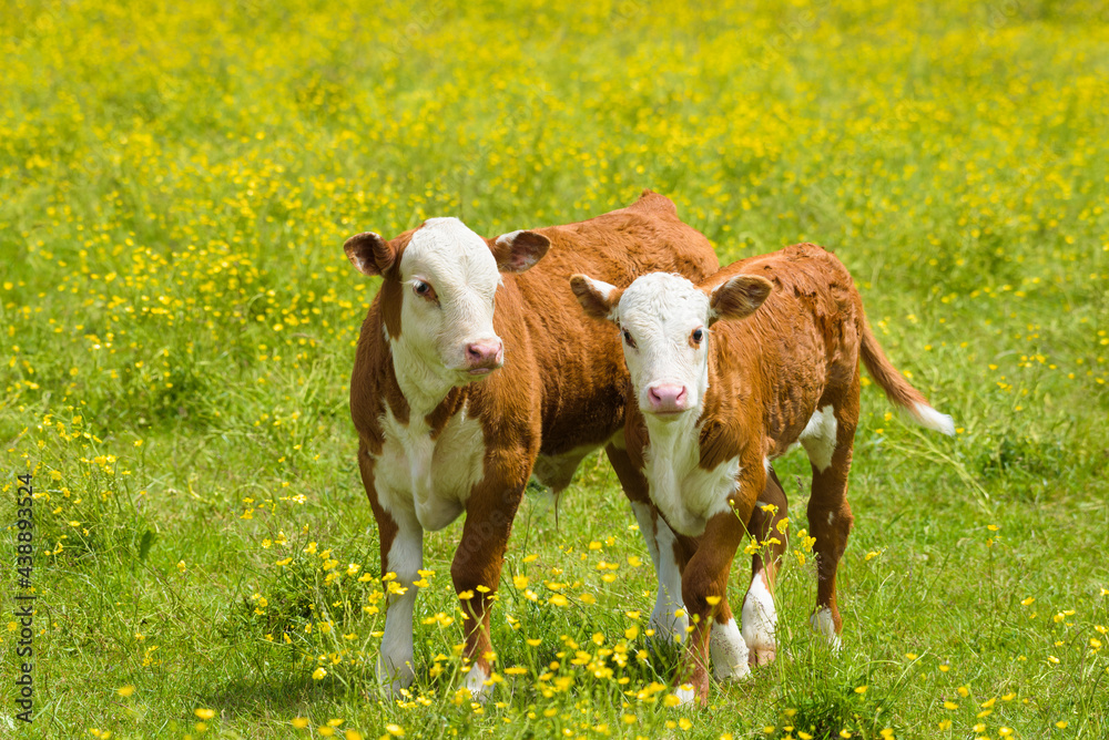 Two young Hereford breed calves in a field of grass with wild buttercups as the pair walk forward