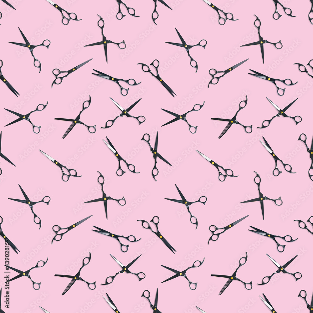 Seamless pattern of black scissors. professional hairdresser black scissors isolated on pink. Black barber scissors, close up. pop art background, for prints or posters