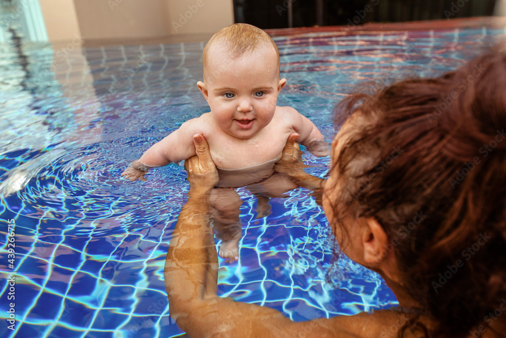 Crop shot from above parent carrying little infant kid in water of pool learning to swim