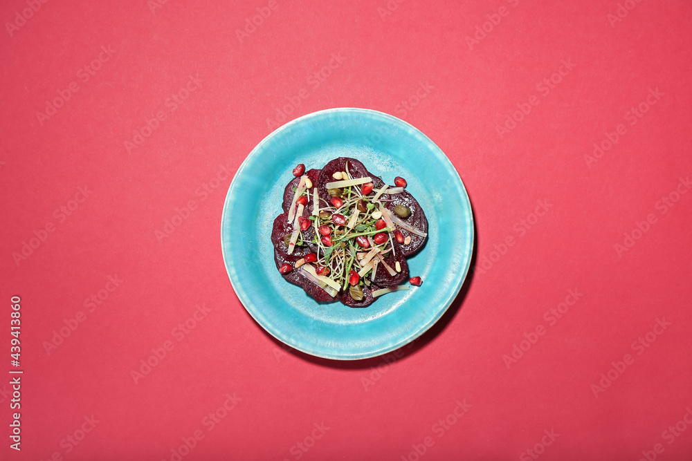 Plate with delicious beetroot carpaccio on color background