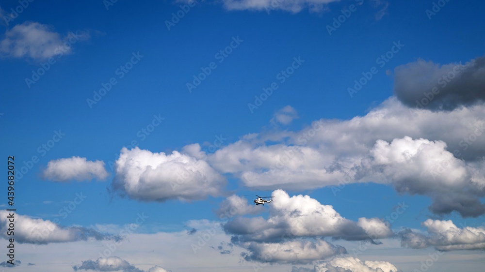 View of the blue sky with white clouds and a flying helicopter.