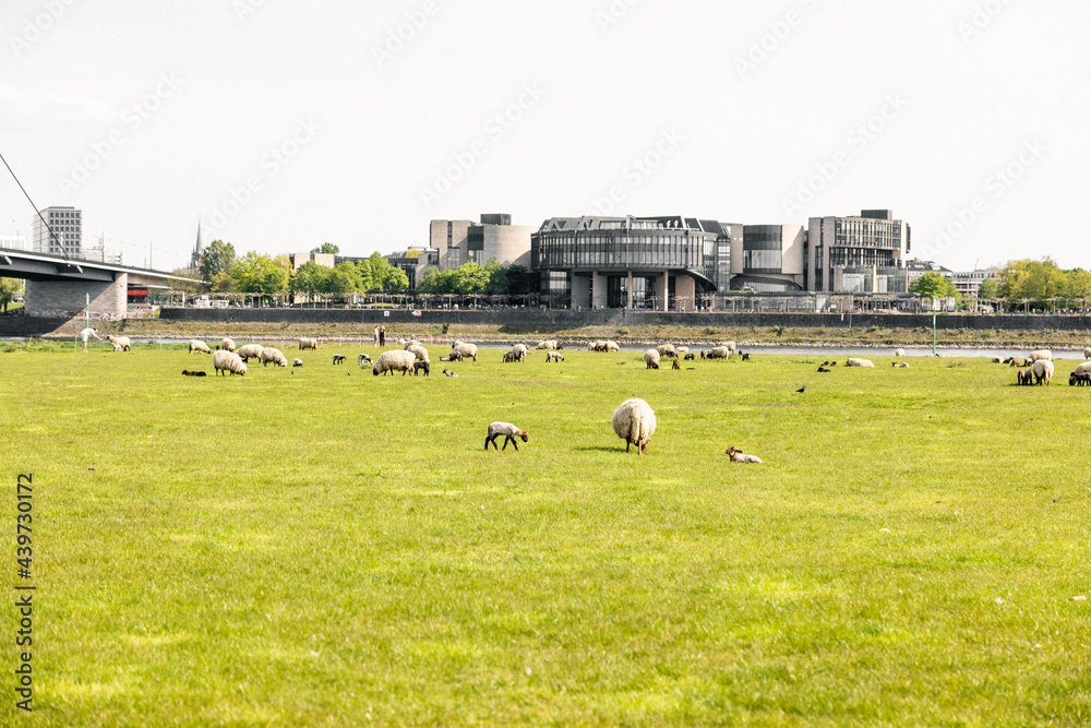 Flock of wooly sheep and lambs grazing in the flat meadow field