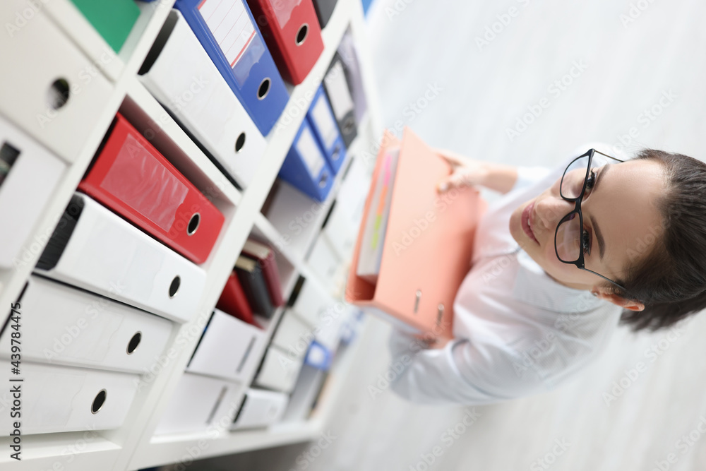 Young woman secretary in glasses takes folder with documents from shelf in archive