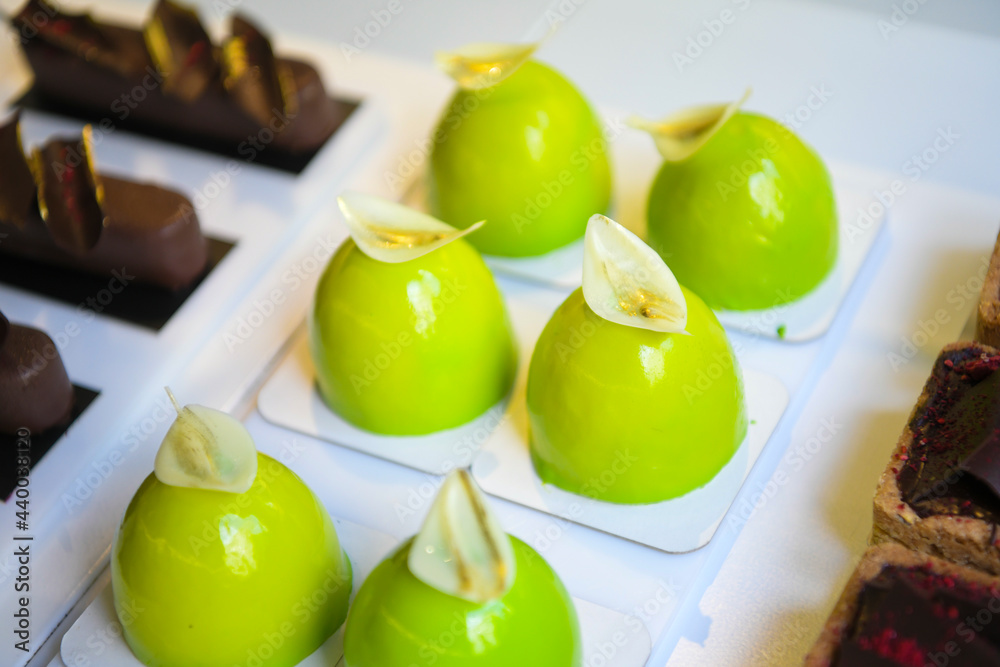 Pastry shop glass display with selection of sweets and cakes. Confectionery shop display background. Delicious sweet treats variety. Small buisness concept.