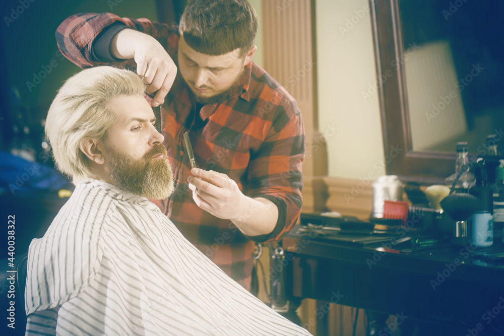 Professional hairdresser cutting brutal man hair in beauty saloon.