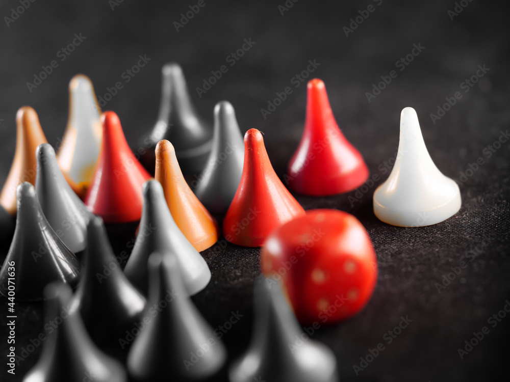 Grayscale shot of board game pieces next to dice on the floor with some of them colored