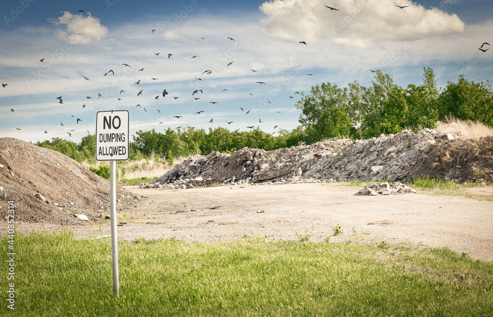 landfill with birds flying overhead in the summer time.