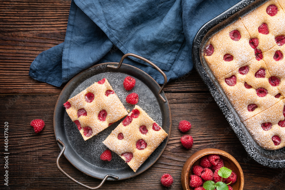 Raspberry cake known as Bublanina sprinkled with powdered sugar