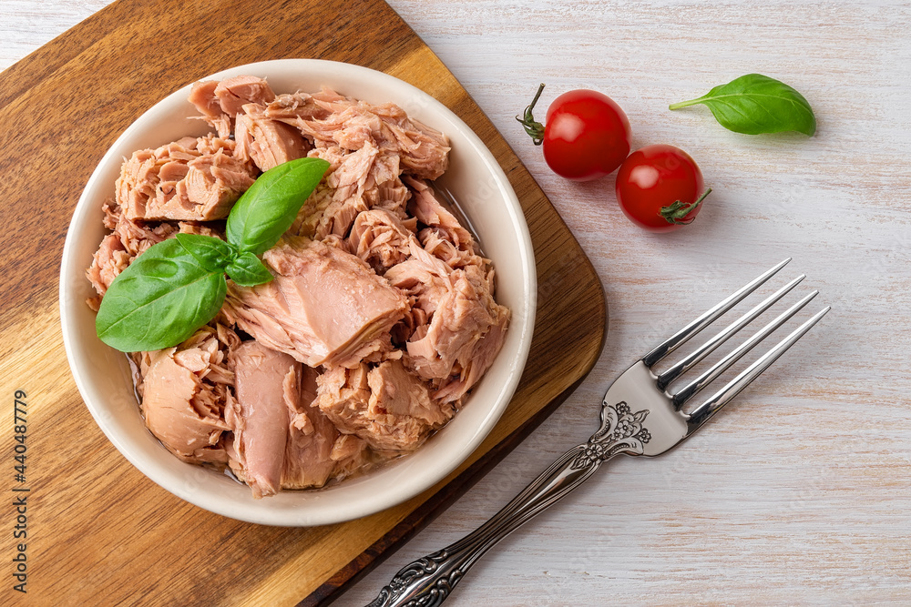 Top view of canned tuna in a bowl, fork and red cherry tomatoes on a white wooden table. Healthy eating snack of preserved tuna meat and fresh vegetables. Low calories tasty seafood.