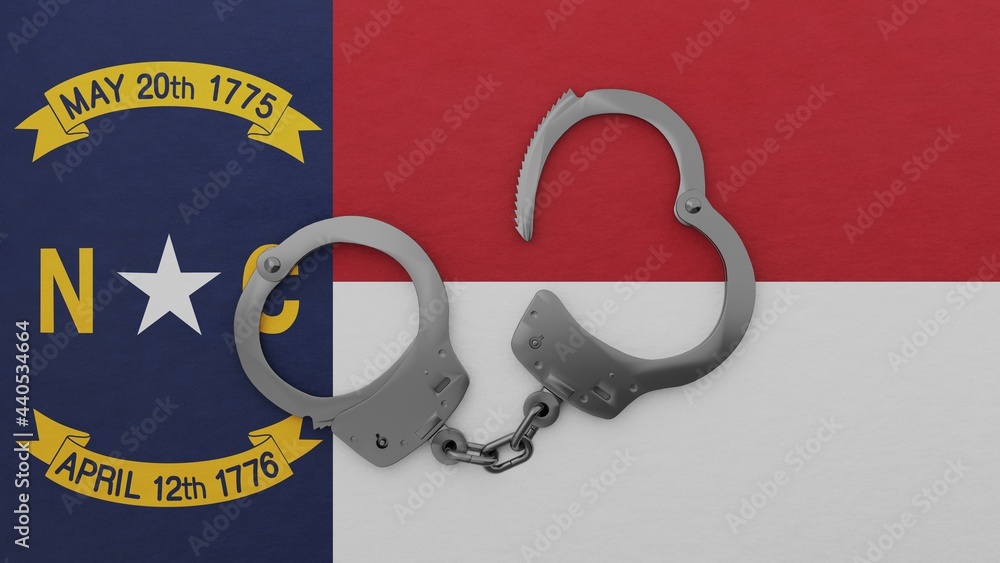 A half opened steel handcuff in center on top of the US state flag of North Carolina