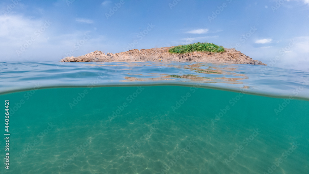 A view of an island half undersea and half of the shore of lonely island, half underwater and half of the island in the middle of Mediterranean sea, Swimming in crystal clear sea water, Jijel algeria.