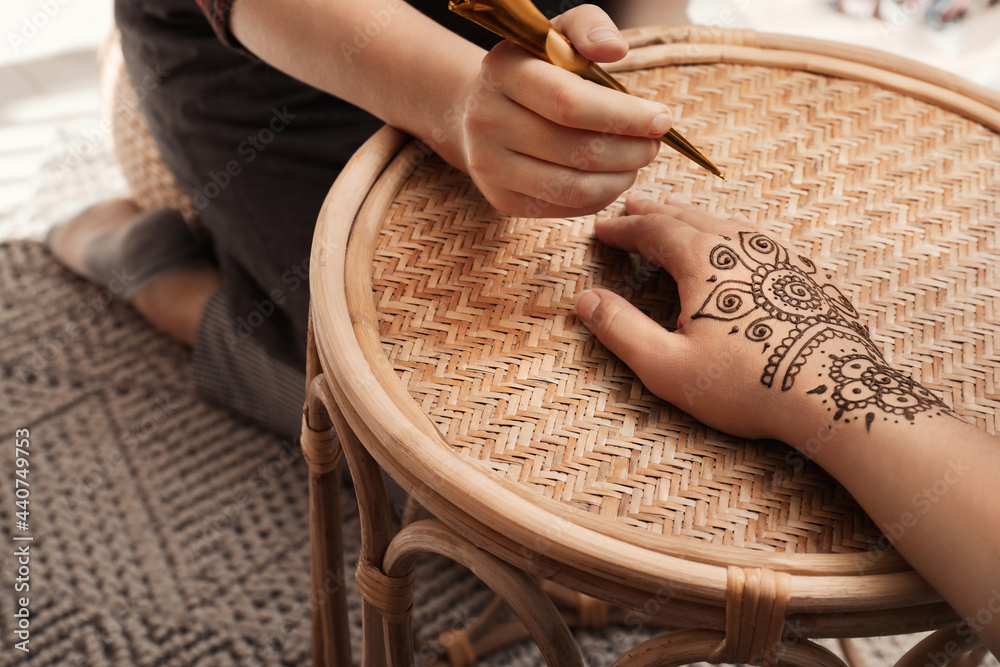 Master making henna tattoo on hand at table, closeup. Traditional mehndi