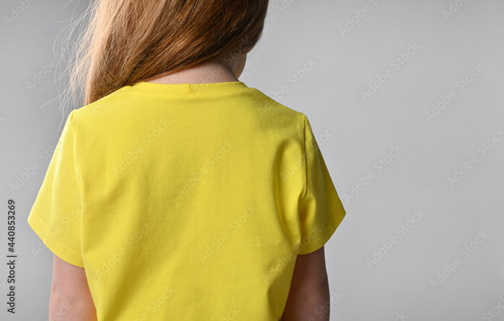 back view of a detail of children's summer wardrobe - yellow cotton T-shirt. short sleeve