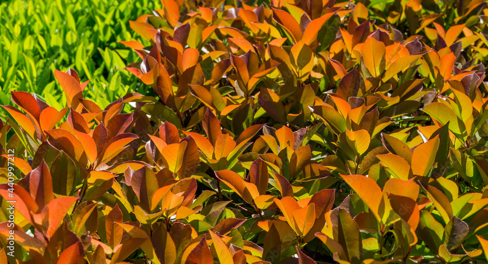 Beautiful red and green leaves of Photinia fraseri 'Red Robin' shrub in city park Krasnodar or landscape Galitsky park in sunny spring 2021. Nature concept background