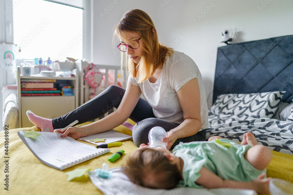 Front view of millennial caucasian woman mother sitting on the bed at home study while taking care and bottle feeding formula milk her newborn baby daughter - education parenthood concept real people