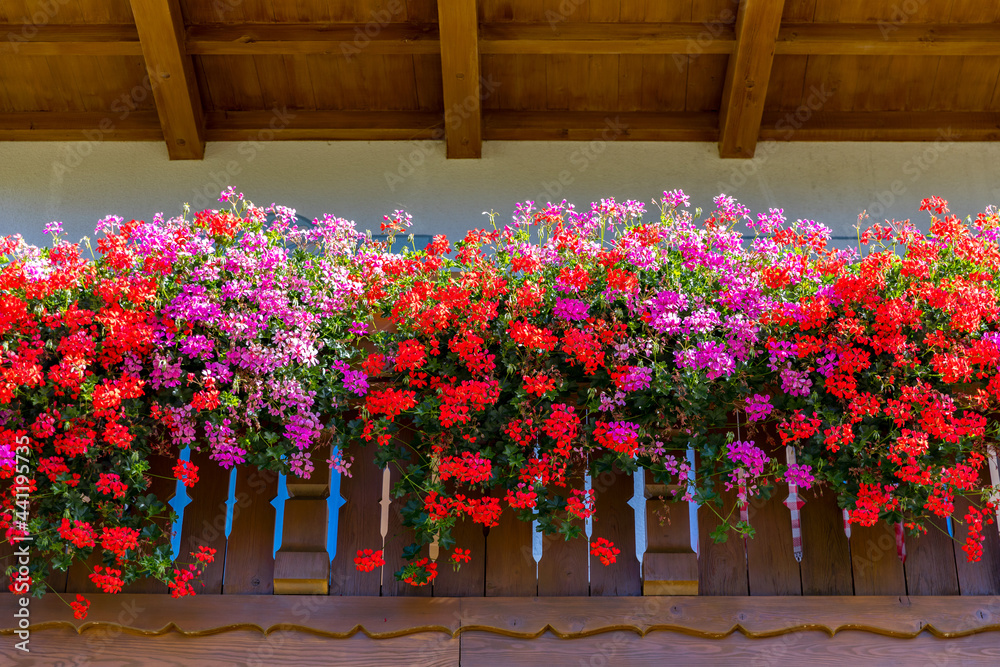 Flower decorated terrace of a house. Background of multiple flowers in balcony.