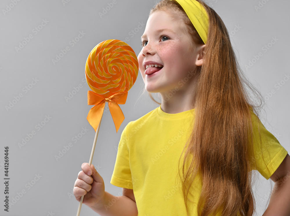 Smiling little red-haired girl in summer fashionable outfit, tasting her big flat candy spiral with a bow. Children's happiness, sugar food.