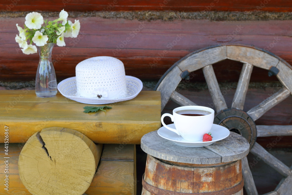 A summer still life with a mug of black tea, bouquet of flowers in a vase, white hat, wagon wheel, wooden barrel and a yellow bench against a log wall.