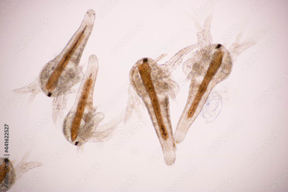 Artemia larvae in light microscope, Artemia plankton under a microscope.