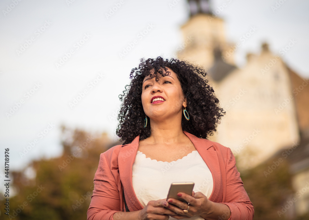 Business woman walking trough street and holding mobile phone.