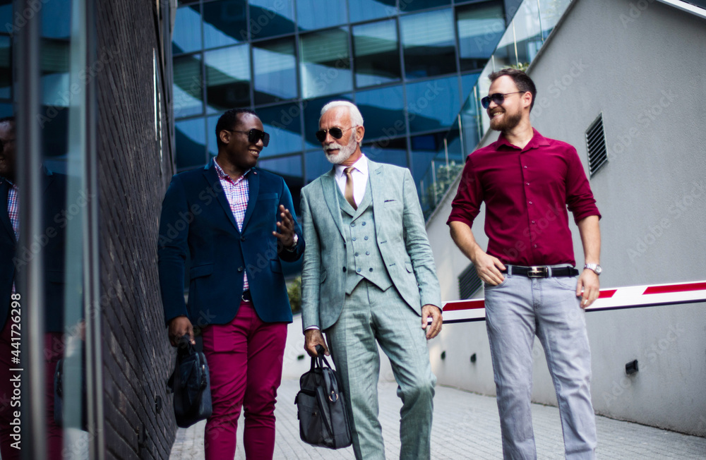Three happy business men walking and talking outside.