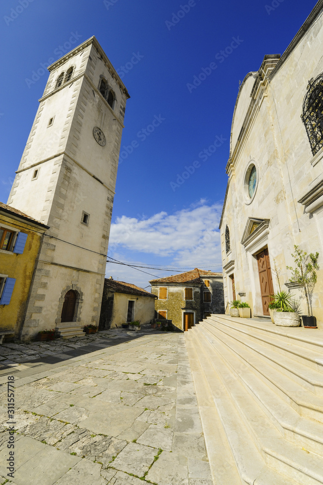 Spectacular yellow-orange sunset over the forest. The sun sets, illuminating the plump clouds with rays