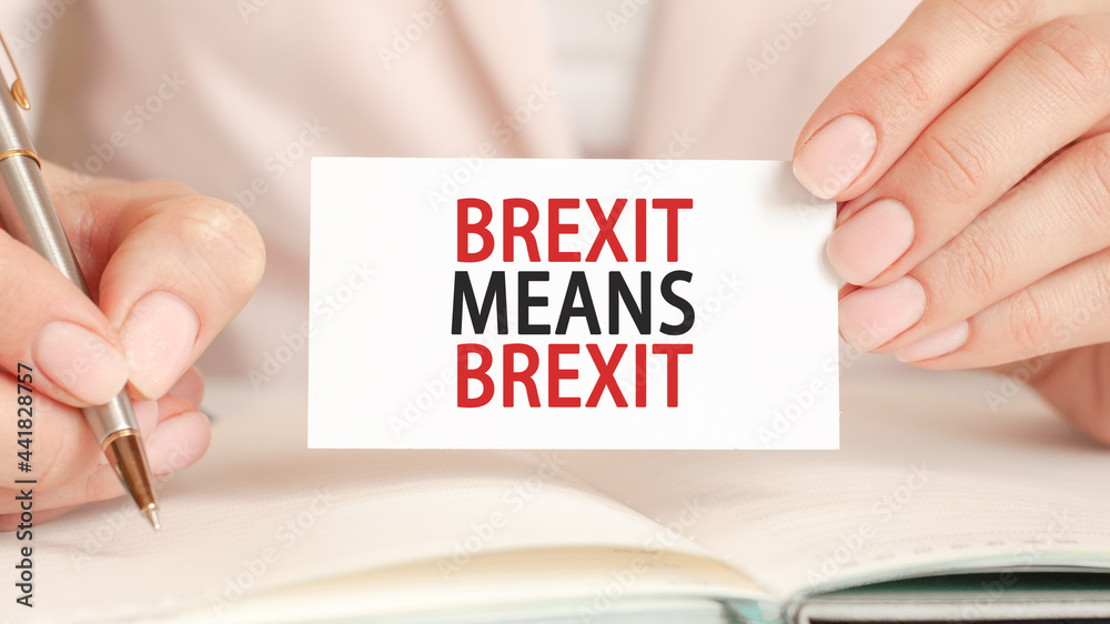 a paper card in the hand of a woman with the inscription brexit means brexit, concept