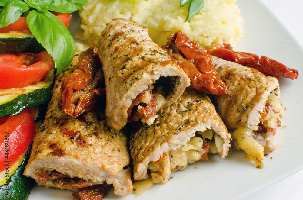Pork rolls with sundried tomatoes and mozzarella