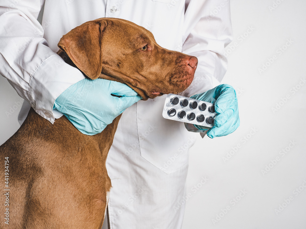 Adorable puppy of chocolate color at the reception at the vet doctor. Close-up, isolated background. Studio photo. Concept of care, education, obedience training and raising of pets