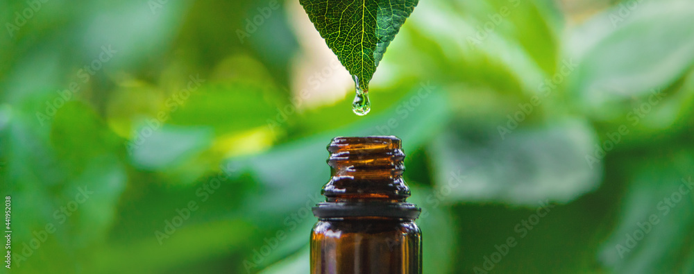 Essential oil extract of medicinal herbs in a small bottle. Selective focus.
