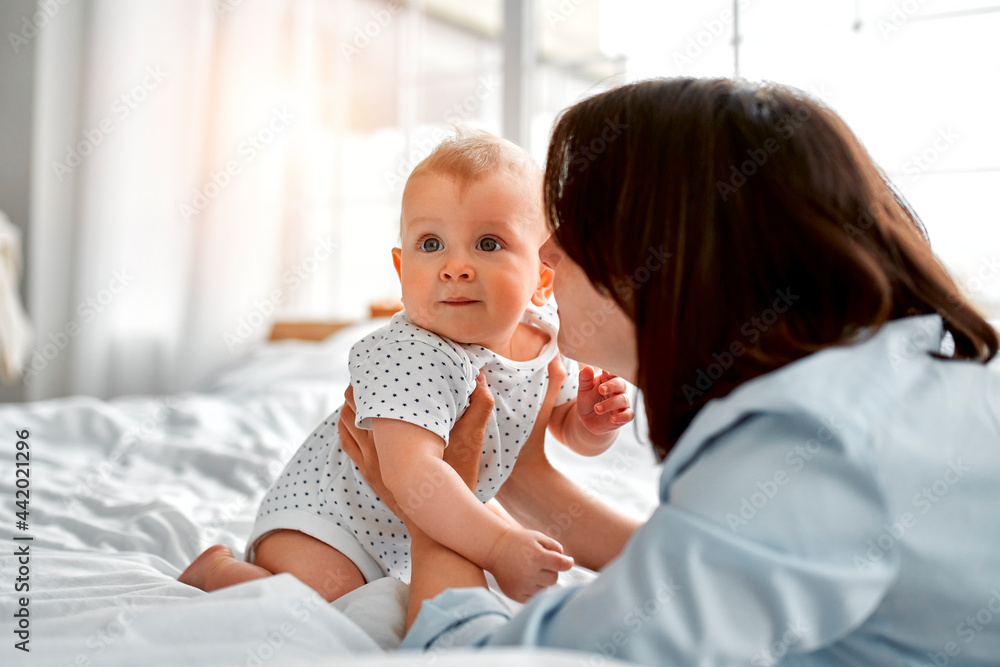 Loving mom carying of her newborn baby at home.Mom and baby boy playing in sunny bedroom. Parent and little kid relaxing at home. Family having fun together. Childcare, maternity concept.