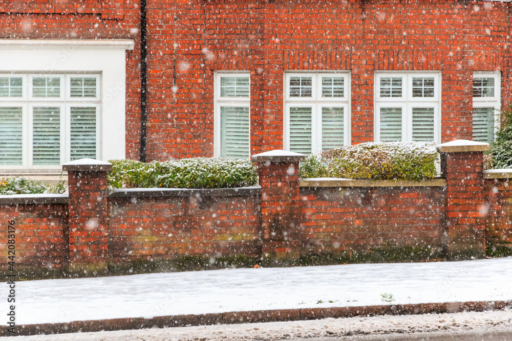 Heavy snow falling on London street in winter, causing icy and slippery pavement