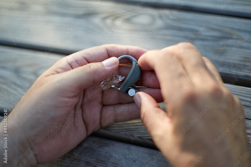 Closeup senior man changing button battery of electronic hearing aid in his hand