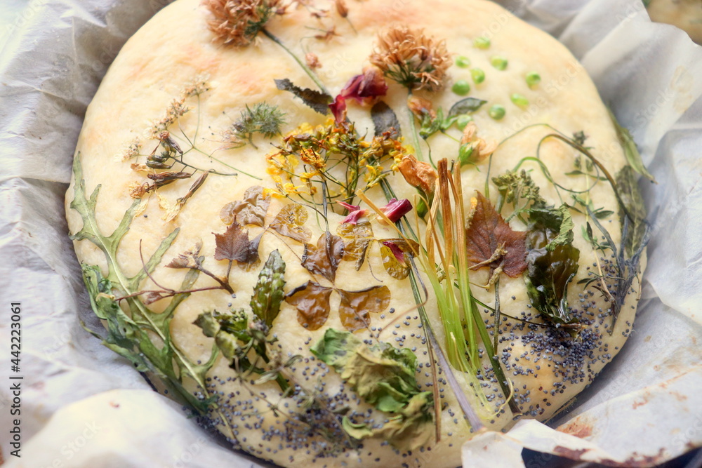 Focaccia flowers, focaccia garden. Creative idea of focaccia cooking. Crispy focaccia with vegetables. Healthy food concept. Trend.