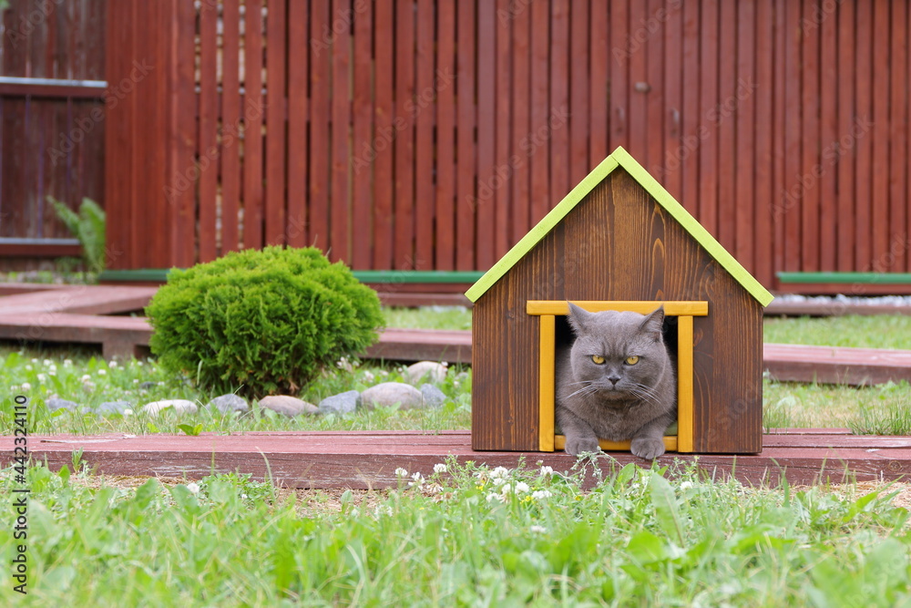 A gray cat is sitting in pet house by the thuja in a garden on the background of dark wooden wall of shed.