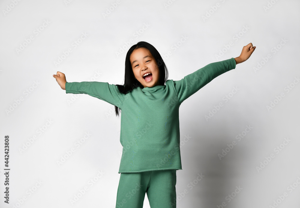 discouraged surprised Asian girl of ten in green clothes spread her arms out to the sides, stretching after sleep, doing exercises.