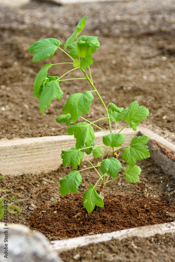 Freshly planted currant seedling in a wooden flower bed