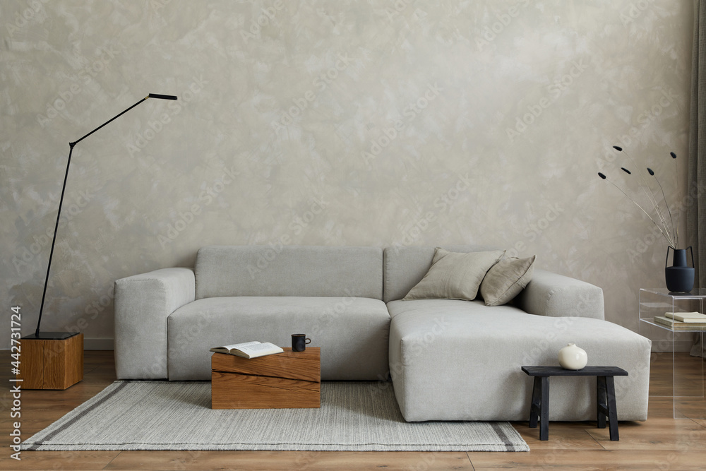 Creative composition of stylish modern spacious living room with grey sofa, wooden cubes, pillows, plaid, carpet, white vases and small personal accesories. Copy space. Template.