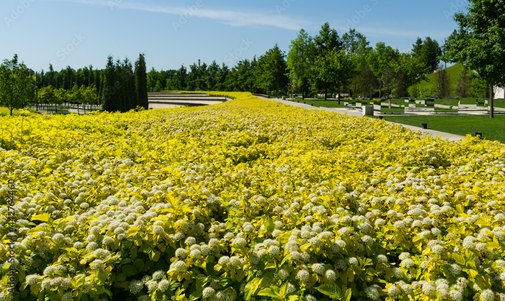 Physocarpus opulifolius Nugget or Ninebark with golden leaves on terraces in public landscape city park Krasnodar or Galitsky. Spring landscape, fresh wallpaper with copy space