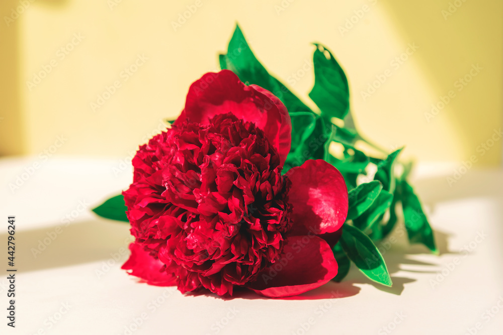 Red peony flower on yellow table in sunlight. Summer, still life. Close up