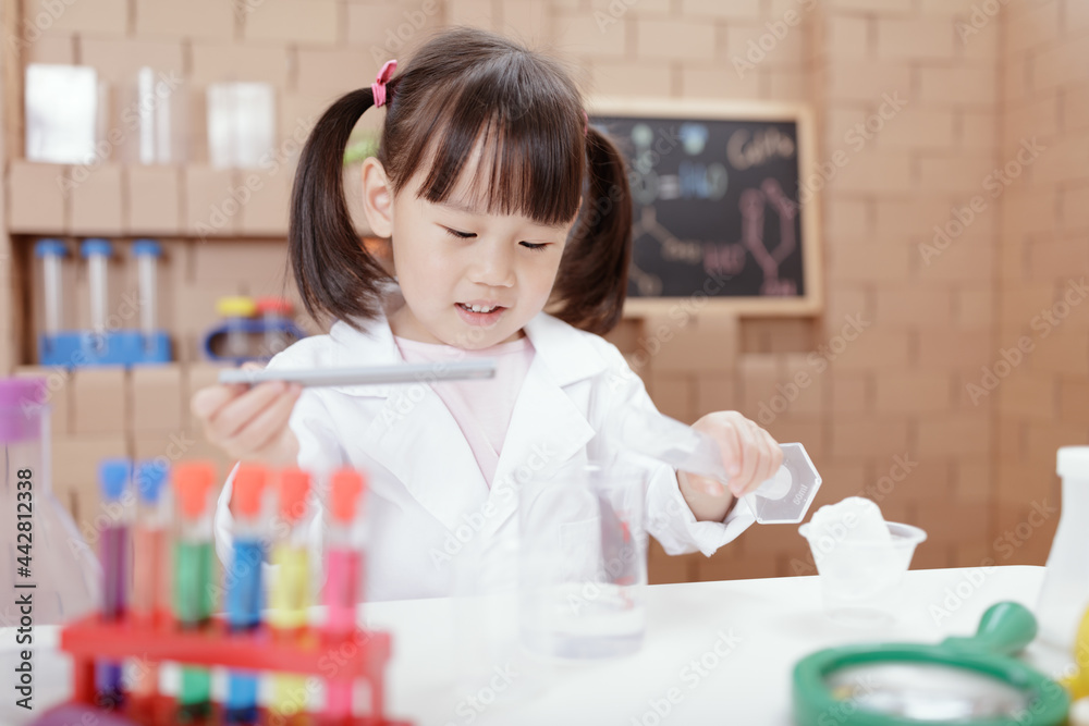 young girl plays science experiment for home schooling